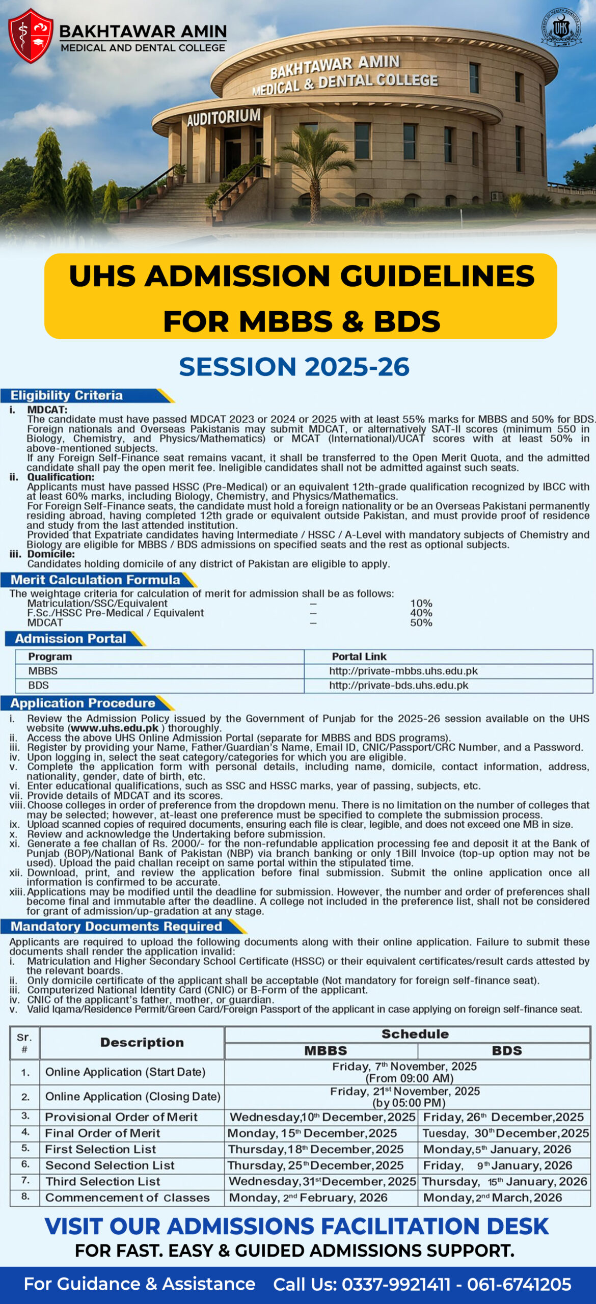 UHS Guidelines for MBBS & BDS Admissions 2025–26